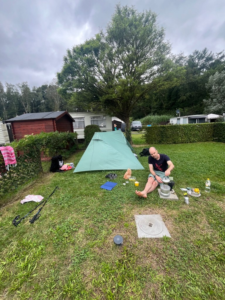 We lopen ineens over een veld met paarse heide en er vliegen drie kwartels op! Heel gaaf. We belanden op de camping, de zeven geitjes, waar ze negen geitjes hebben. Twee miniminimini… We zetten onze tent op, douchen, en koken een prutje, tortellini met rode saus en een paprika, vooraf worteltjes en een half eitje met salie (gevonden in de tuin van de conciërge van de camping).