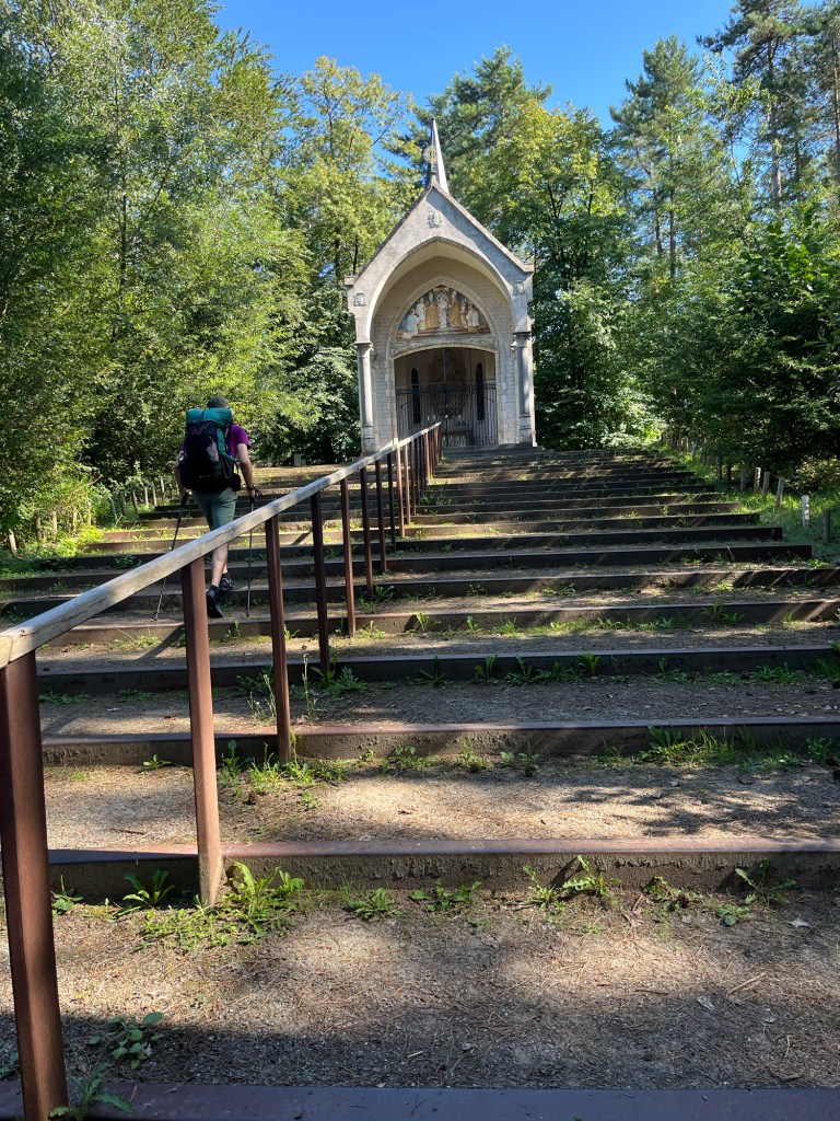 Vanmorgen hebben we een stuk van de GR5 gemist omdat we naar de supermarkt gingen. Het gebrek aan ontbijt zorgde voor honger tijdens het boodschappen doen. We hebben dus veel te veel gehaald. Op een bankje aten we wat fruit en yoghurt. We liepen snel verder om ergens in het bos koffie te kunnen drinken. Dichtbij een Lourdes- grot deden we dat.