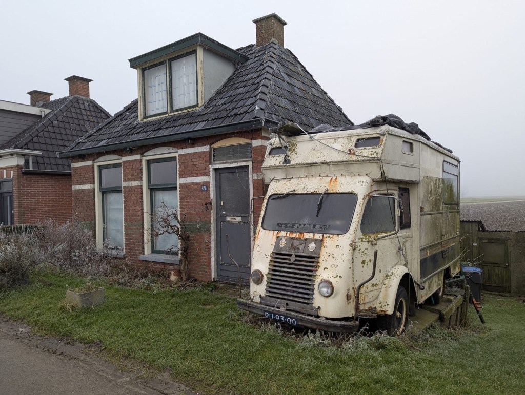 We vergaten bijna te betalen en gingen vol goede moed weer op pad. Vandaag zou de zon gaan schijnen. Niets aan de lucht lijkt erop dat het op gaat klaren dus wij lopen over de Oude Bildtdijk in plaats van langs de Waddenzee. We worden zo hartelijk begroet door alle mensen waarbij we naar binnen kijken. Mensen zwaaien met hun hele arm de lucht in, hun hele arm! Echt! Anyway langs deze dijk staan allemaal toffe schattige kleine en grote huizen, deels verzakt, sommige zeer verzorgd andere zeer onverzorgd. We kijken graag naar binnen en zwaaien enthousiast terug als er iemand zwaait.