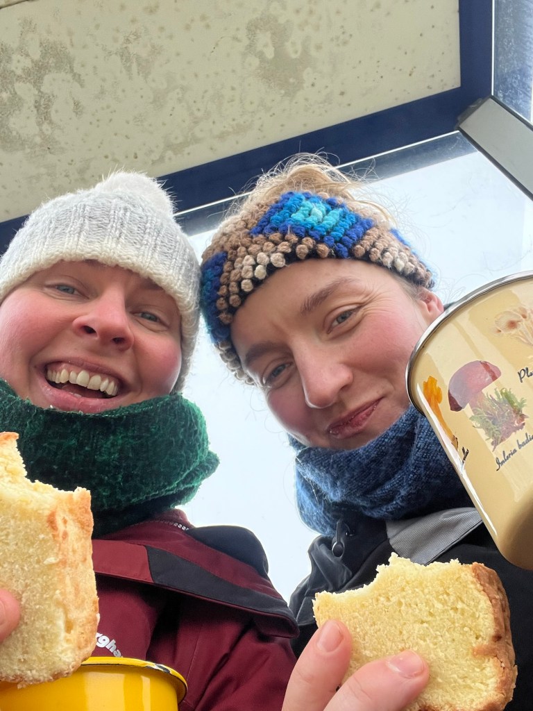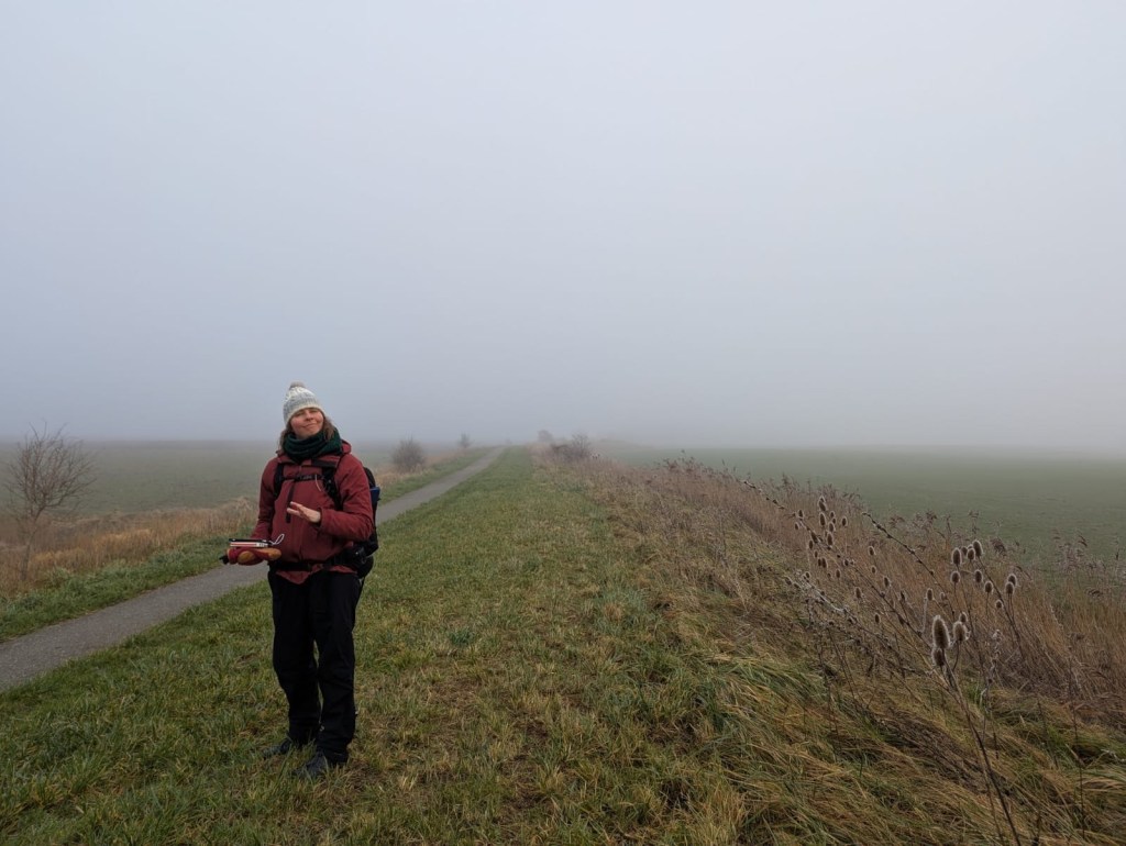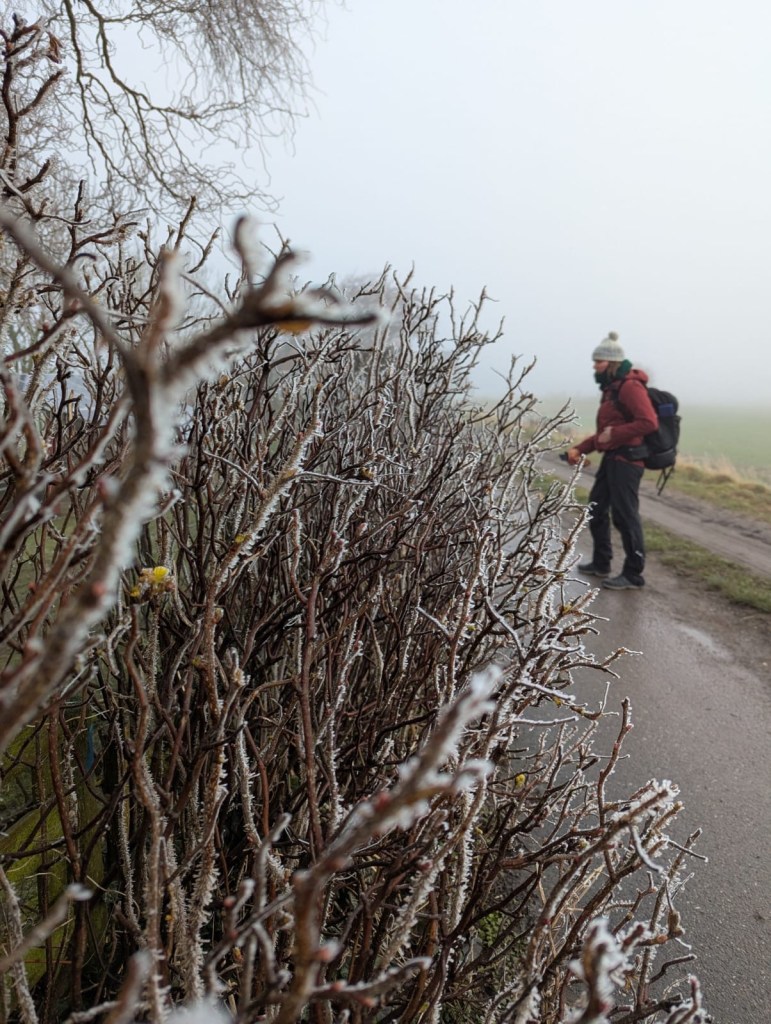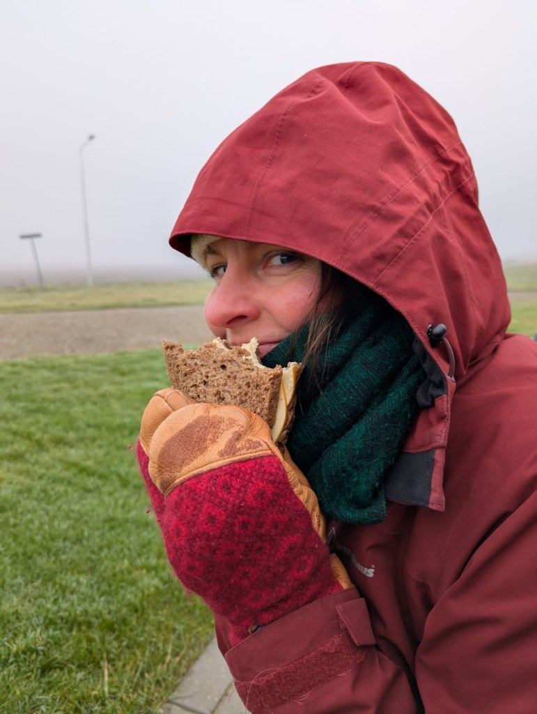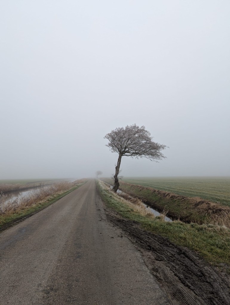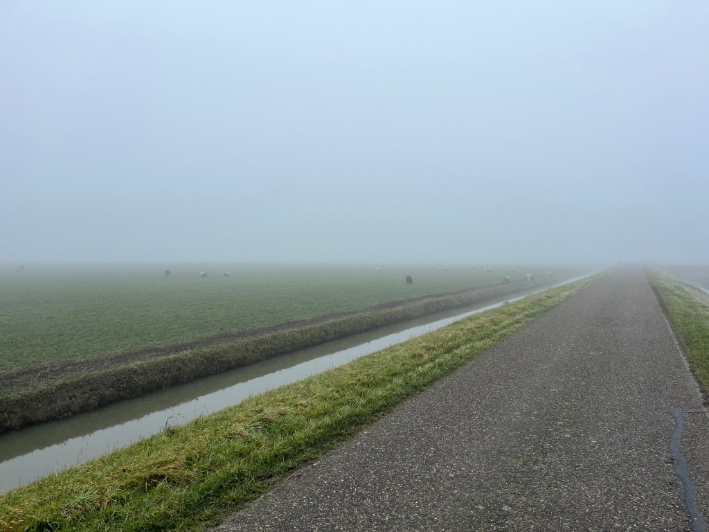 We denken dat de wereld stopt na de mist, maar er blijkt toch steeds wat te komen. We lopen, we lunchen. We bibberen. We zien schapen en paarden. We worden begroet door alle mensen die we tegenkomen en dat is gezellig!