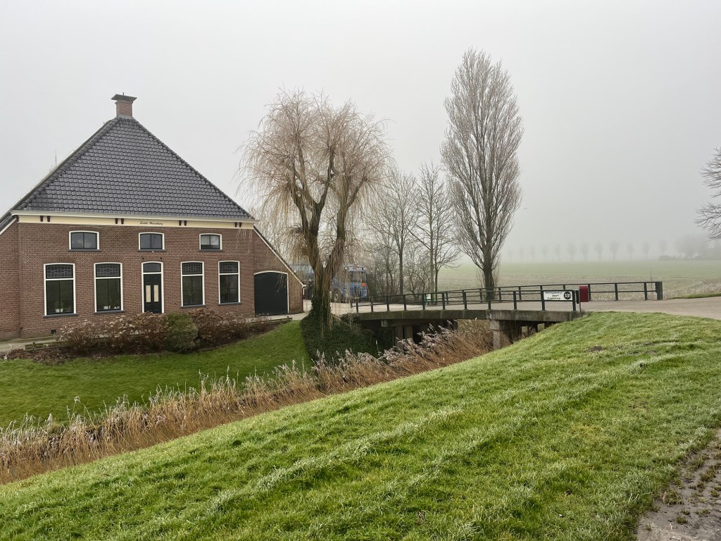 We worden hartelijk ontvangen in de Postduif in St Jacobiparochie. We drinken thee en warme chocolademelk. We zijn tot op het bot koud. Om 17u zijn we welkom bij onze vrienden op de fiets. Het schemert al als we door de mist de enorme boerderij in de mist zien opdoemen. “Uilenburgh”.