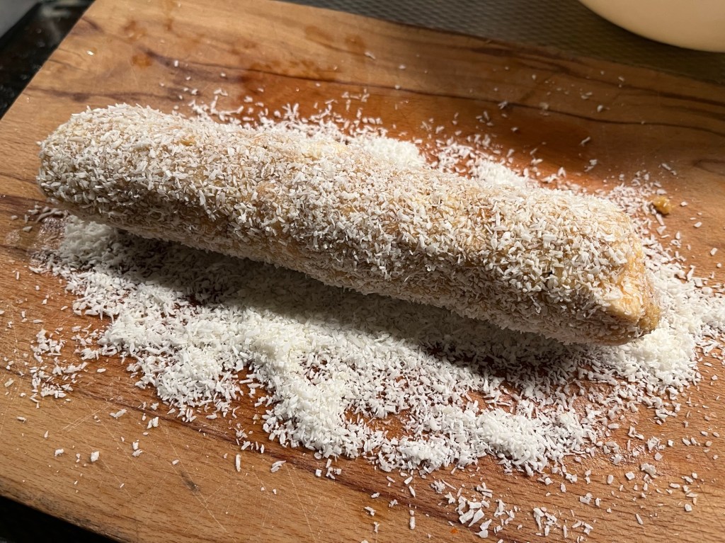 - Rol de rollen door de kokos en zorg dat het overal zit. Dan in vershoudfolie rollen en minimaal 1 uur in de koelkast.