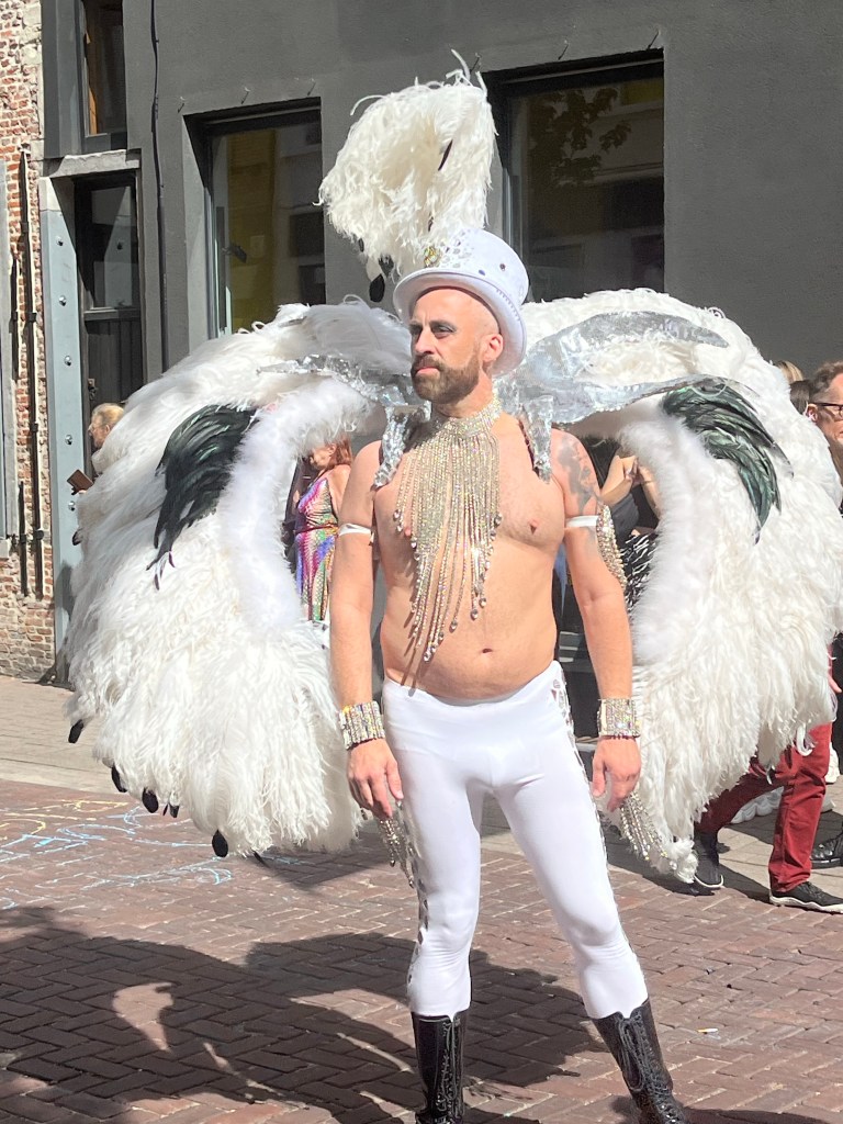 We vervolgen onze wandeling. Ondertussen kleurt Antwerpen in regenboogkleuren. De pride begint om 14u. We halen een frietje bij Frietkot Max. Achter ons staat een dame die vraagt of we Nederlands praten. Haar vrienden zijn terug naar Nederland en zij heeft nog een extra bon voor twee gratis zakken friet en die mogen wij van haar hebben!
