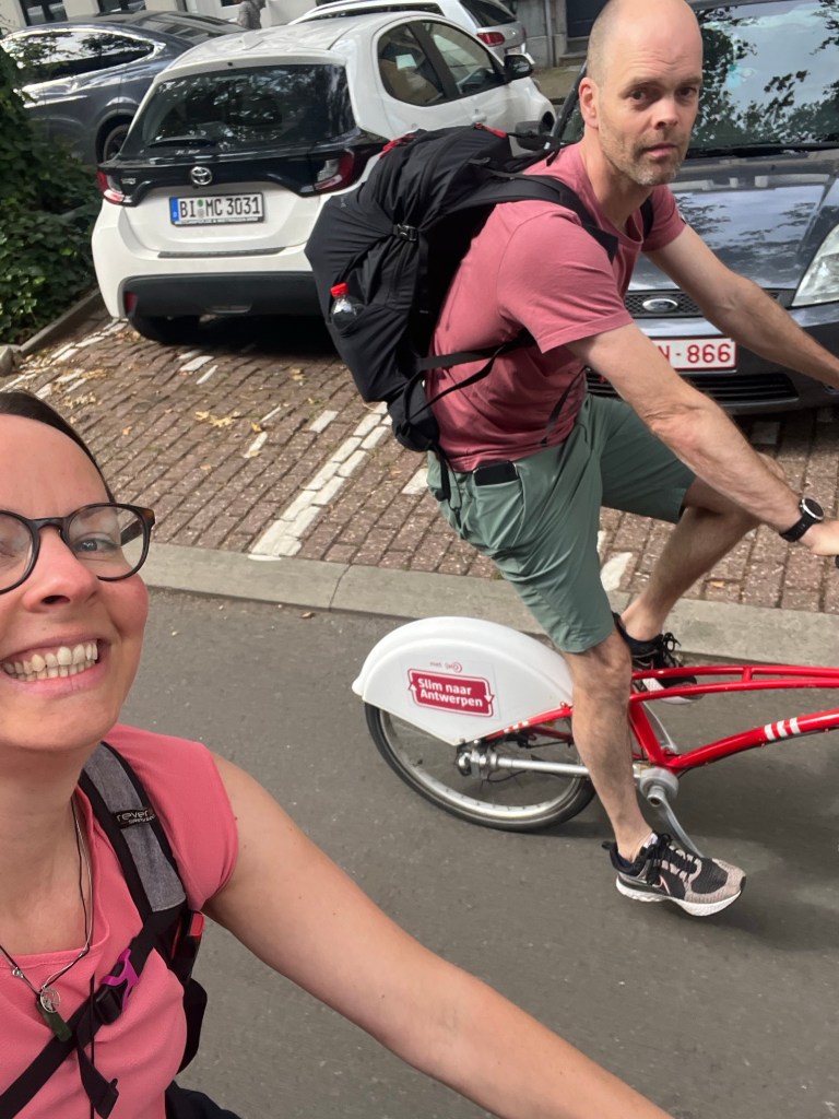 Zondag hebben we fietsen gehuurd. Velo Antwerpen is een heel handig concept. Je neemt een abonnement voor een dag, je betaalt 5 euro en je kunt 30 min gratis van een fiets gebruik maken. Door heel Antwerpen heen staan overal van die fietsen. Op de app kun je zien waar ze nog staan en waar de stalling nog vrij is. Om te proberen fietsen we naar onze ontbijtplek Emma. Werkt prima. We fietsen naar de beeldentuin Middelheim.
