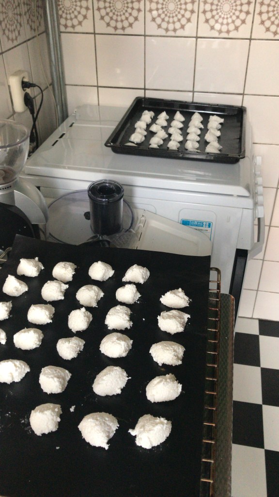 Door middel van 2 lepeltjes hoopjes vormen op het bakblik, dan 20 min in de oven totdat ze lichtbruin zijn.