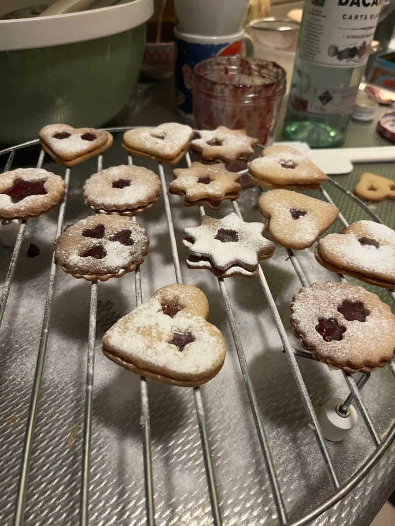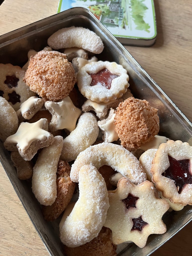 Elk jaar voordat het thema-kerstfeestje is, bak ik zo’n 200 kerstkoekjes. 5 blikken vol. De vakanties in Süd Tirol bij mijn tante Amerentia gaven me al een voorliefde voor de koekjes. Waar de oorsprong ligt kan ik niet helemaal vinden, maar ze worden gegeten in Duitsland, Zwitserland, Oostenrijk en in ieder geval bij mijn tante in Meran, Noord Italië.