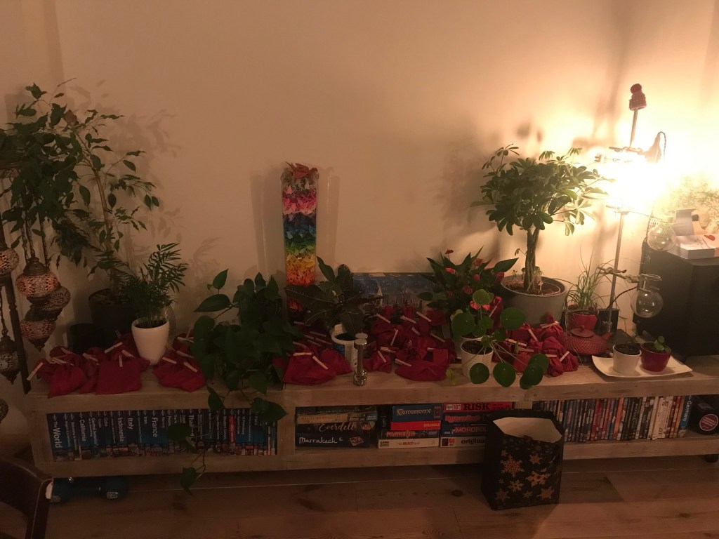 In 2021 ben ik begonnen met een nieuwe traditie. Wie houdt er nou niet van een heleboel cadeautjes? Een adventskalender is altijd al een wens van mij geweest. In 2020 heb ik die van Rituals gekocht. Deze is gevuld met dingen die ik niet (allemaal) echt wil hebben, zoals een washandje of een zeepje en een haarmasker. Toen heb ik een tafelkleed bij de kringloop gekocht, en heb ik daar 150 zakjes van genaaid. Voor iedereen in huis heb ik een adventskalender gemaakt, inclusief mezelf. Ik koop het een deel van de cadeautjes zelf en ik heb ook een aantal vriendinnetjes en Paul gevraagd om voor mij iets in mijn adventskalender te stoppen.